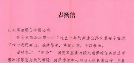 菏泽运管中心获市交警高速大队致信表扬